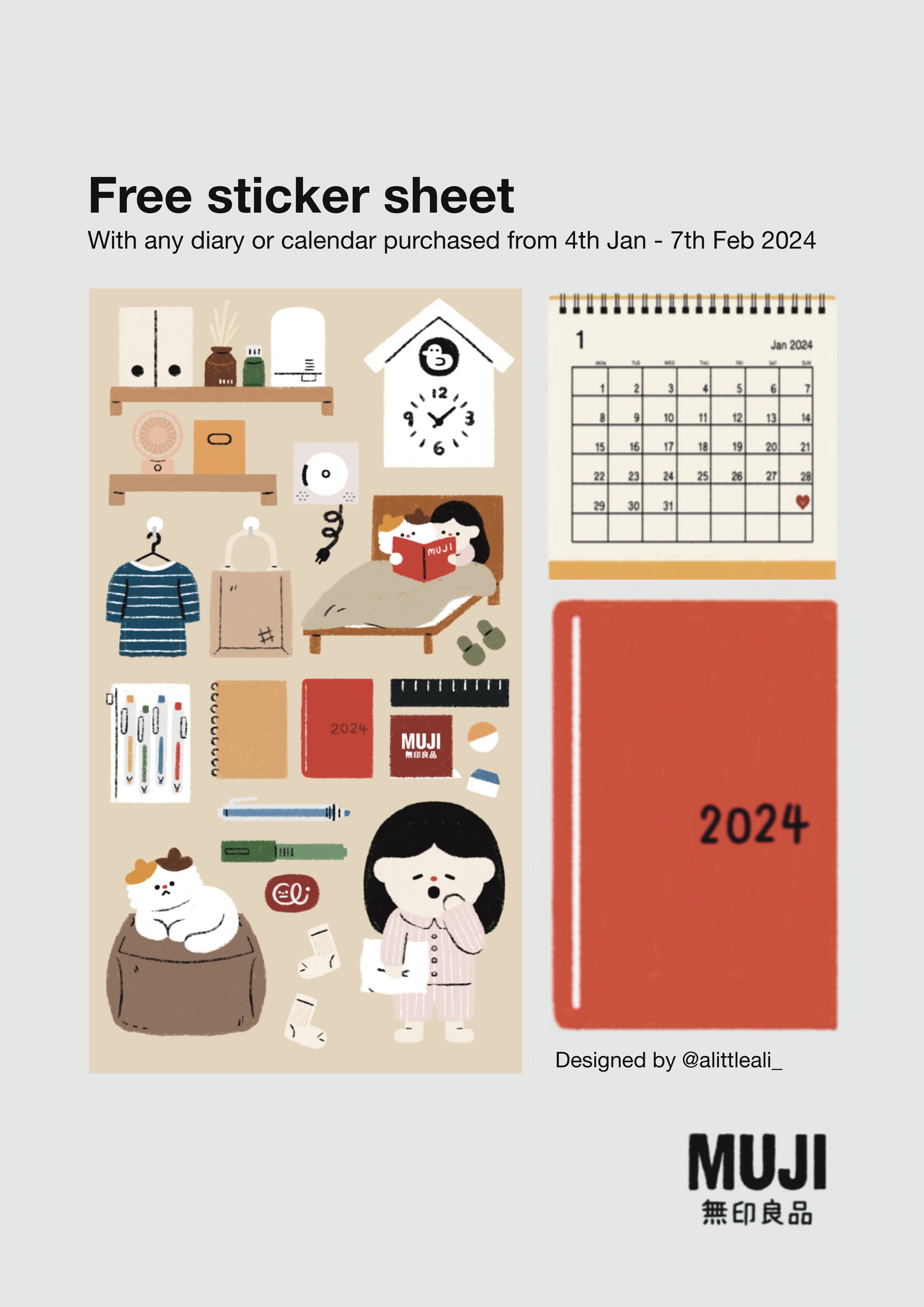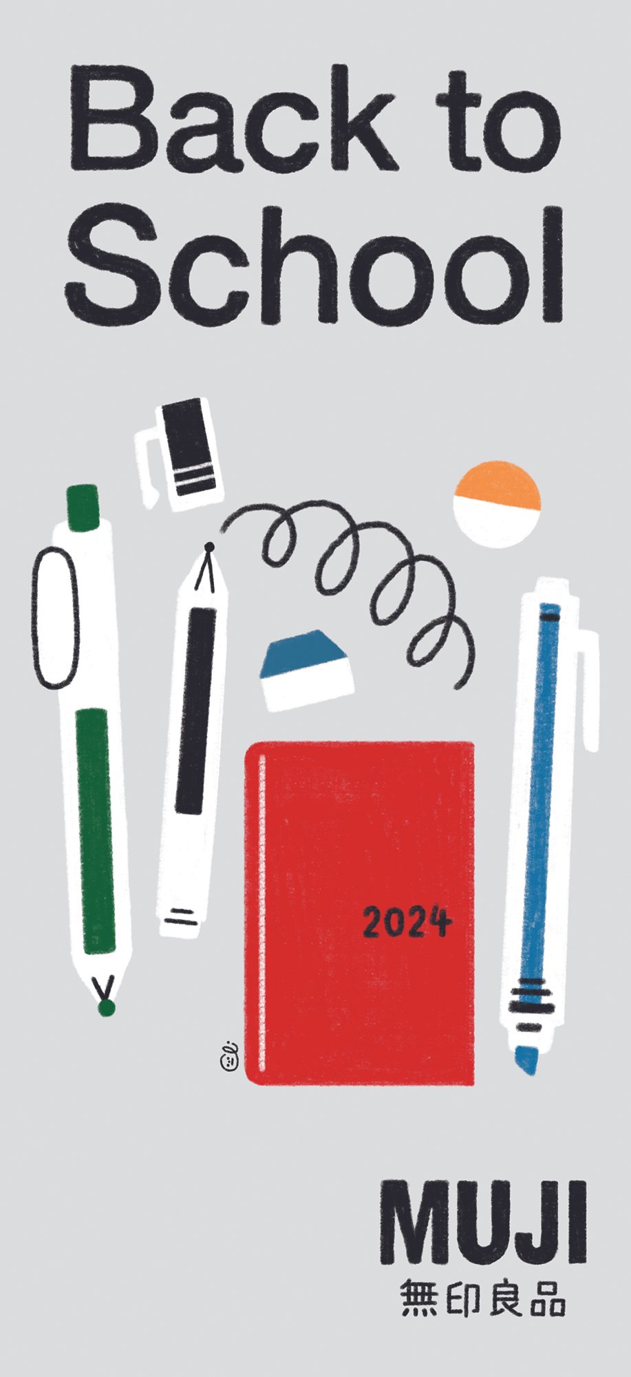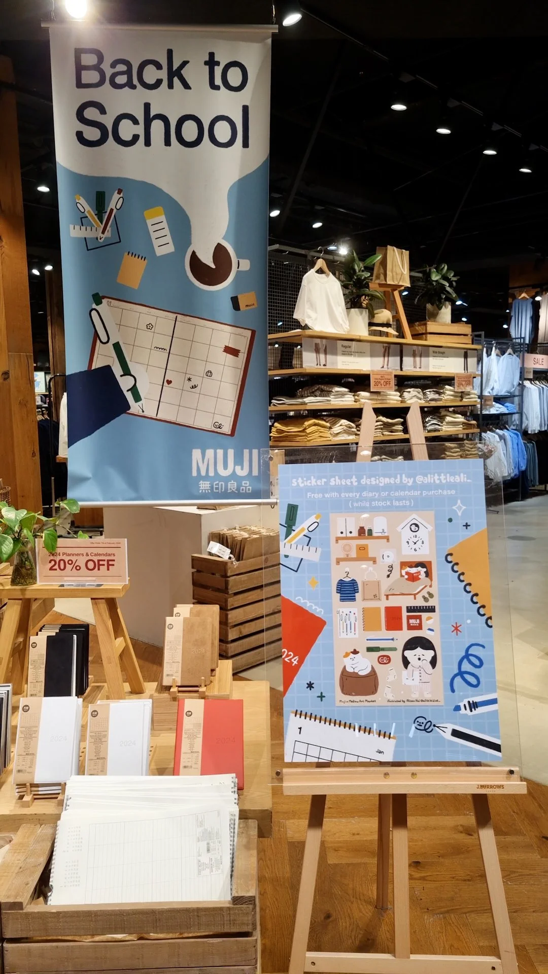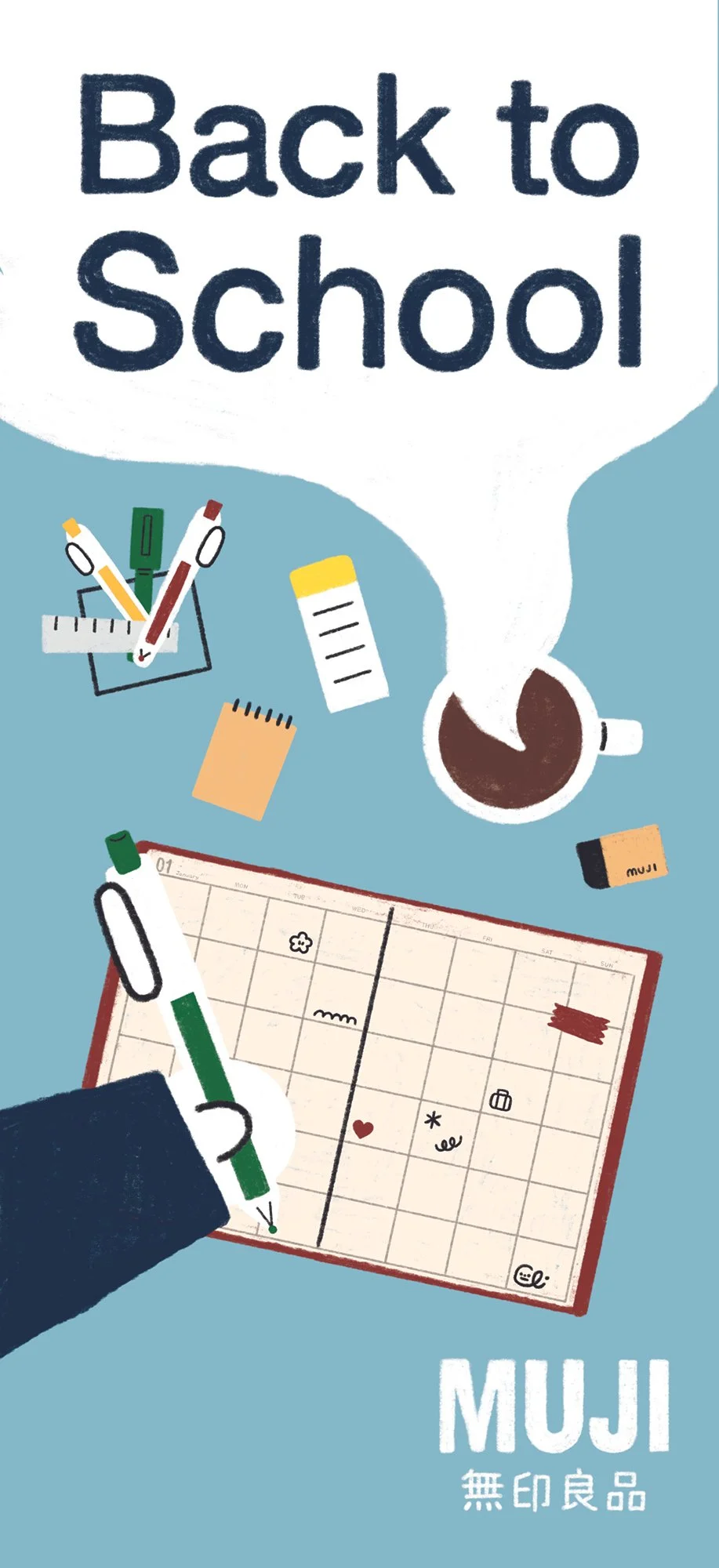 I worked with MUJI (Australia) on their 2024 Back to School campaign, creating playful in-store illustrations and an exclusive MUJI-themed sticker sheet offered with diary and calendar purchases. The visuals added a warm, approachable touch to MUJI’s minimalist stationery range.